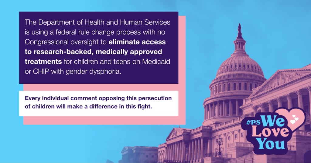 The #PSWeLoveYou campaign believes that we must post a massive public response opposing these rule changes so that the public record of this conversation reflects the truth about gender-affirming care and its impact on the entire 2SLGBTQIA+ community, including kids and teens.